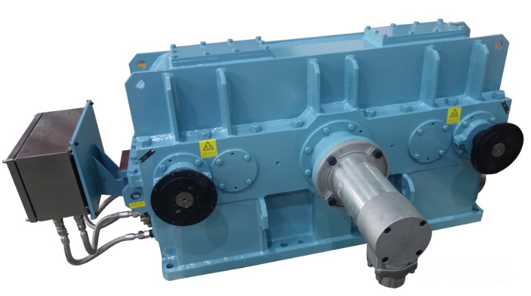 該產(chǎn)品應(yīng)用于高壓蒸氣壓氣機機組,設(shè)計功率為 20MW,輸入轉(zhuǎn)速 3000r/min,輸出轉(zhuǎn)速 9500r/min,結(jié)構(gòu)形式為一級水平人字齒布置傳動,高速軸帶全自動盤車,可以保證高轉(zhuǎn)速下安全脫開。齒輪箱工作效率 >98.5%,噪音 <85 分貝。運行各項指標(biāo)均滿足API要求。